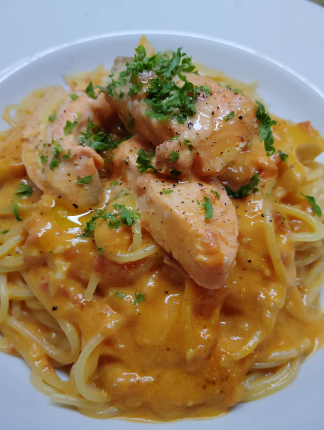 写真は、秋鮭とキノコのトマトクリームソースです。
