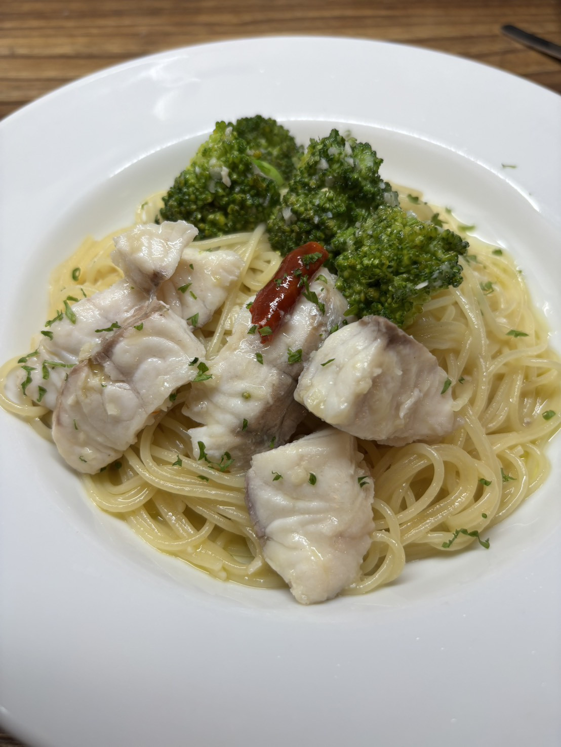 写真は、ホウボウとブロッコリーのペペロンチーノです。