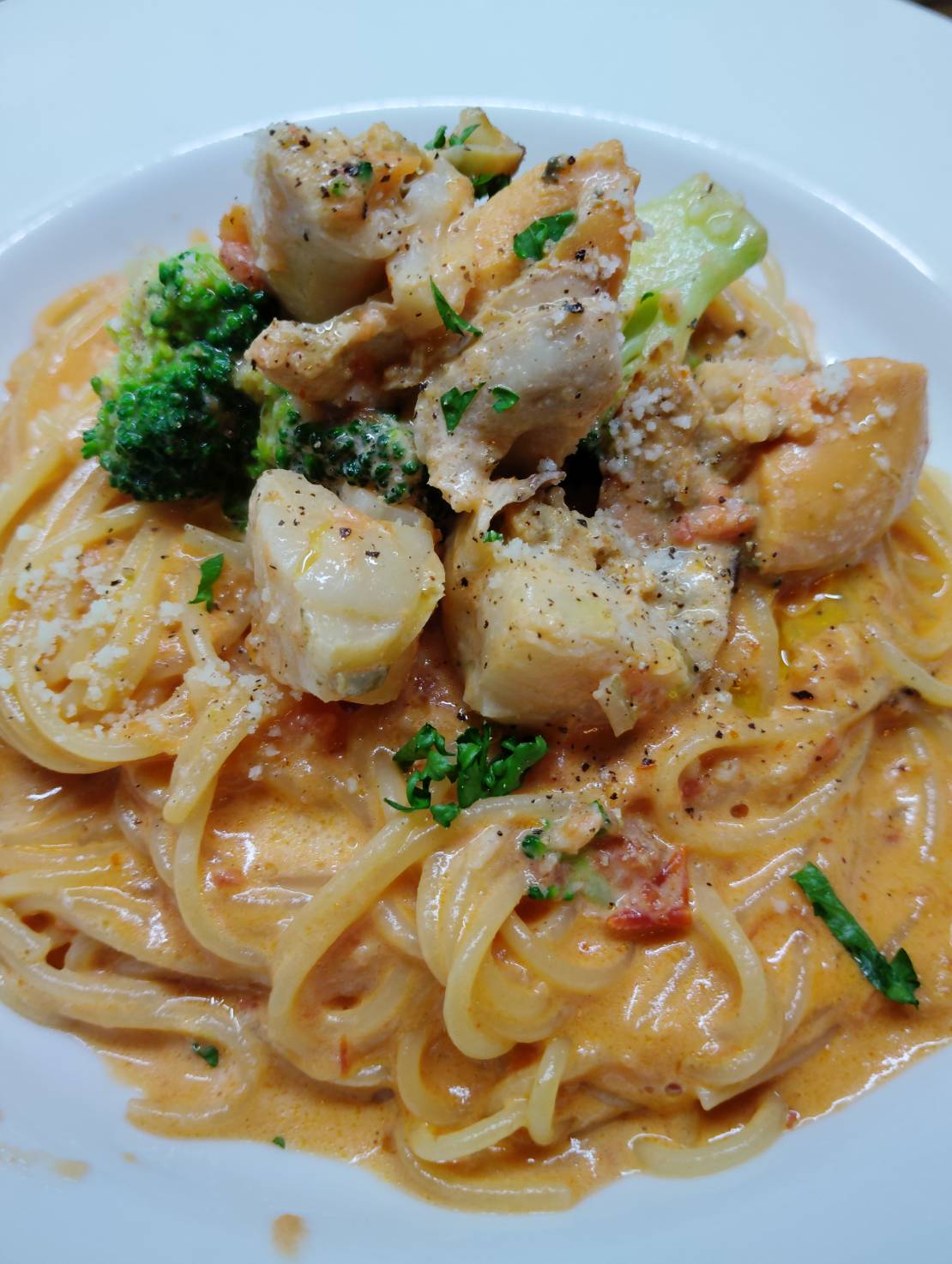 写真は、ホタテとブロッコリーのトマトクリームソースです。